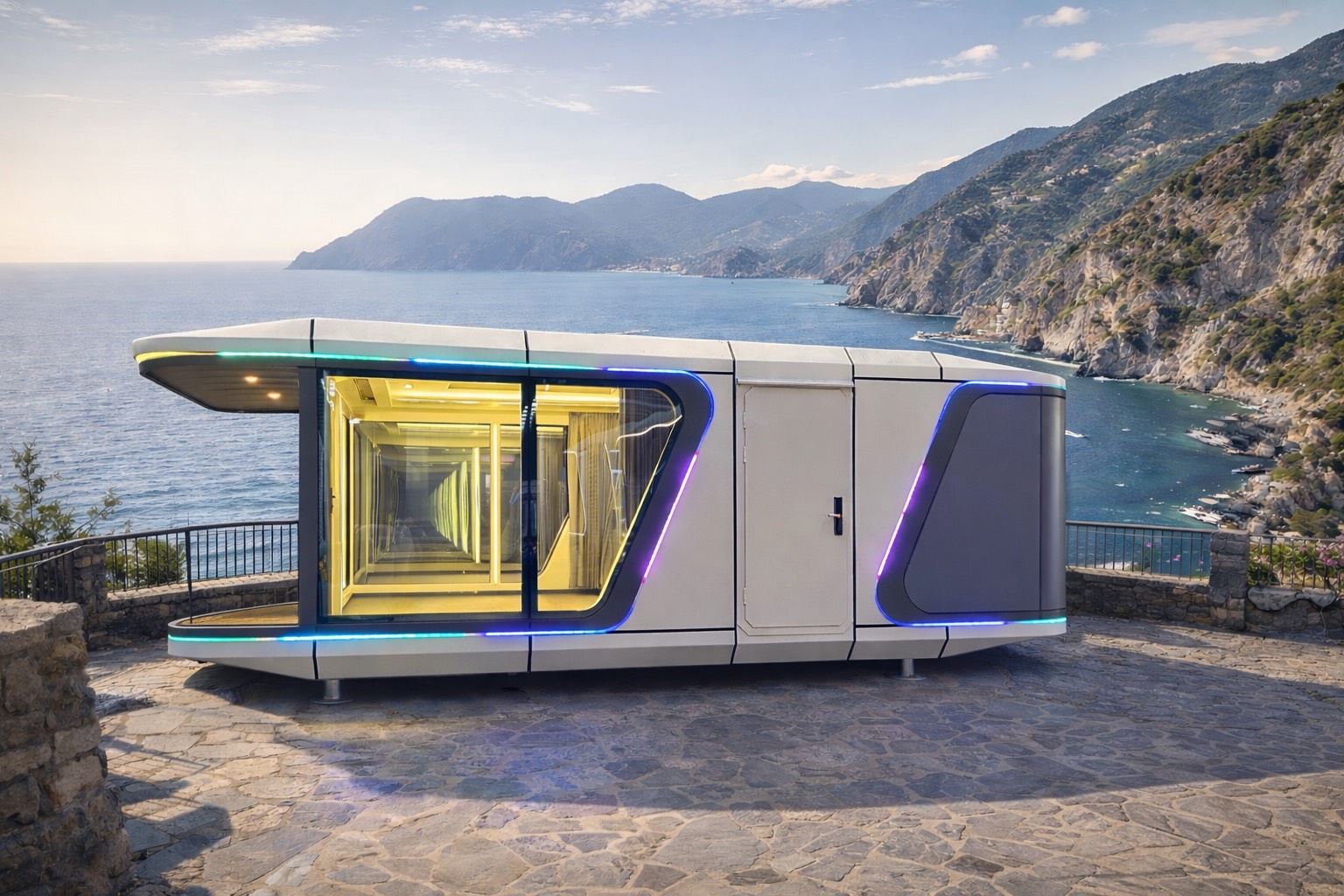 Nowoczesny moduł mieszkalny o powierzchni 28 m² z eleganckim balkonem i panoramicznymi przeszkleniami. Solidna konstrukcja, inteligentne systemy sterowania i pełne wyposażenie łączą się tu z wykończeniami premium, tworząc komfortową i funkcjonalną przestrzeń do życia i relaksu.